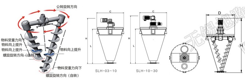 SLH型雙螺旋錐形混合機由傳動部分、筒蓋、螺旋、筒體、出料閥等組成。