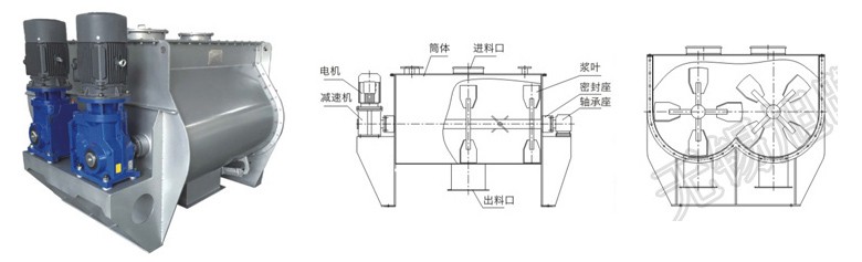 該機為W形的臥式筒體,在減速機的驅動下,通過鏈條與鏈輪或齒輪兩種方式將兩根主軸槳葉反方向旋轉,進行混合。